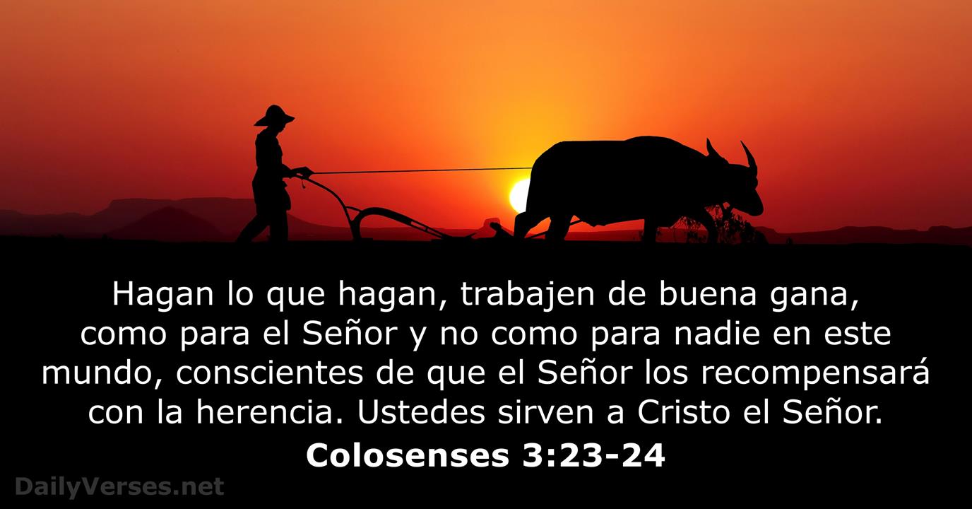 En el libro de Colosenses 3:23-24, se nos dice: Y todo lo que hagáis, hacedlo de corazón, como para el Señor y no para los hombres, sabiendo que del Señor recibiréis la recompensa de la herencia, porque a Cristo el Señor servís.
